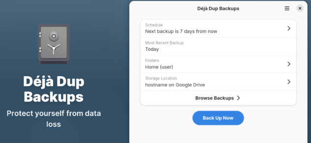 Unlike many backup tools that rely on command-line operations, Déjà Dup offers a clean graphical interface. Even users with limited Linux experience can easily navigate the application.