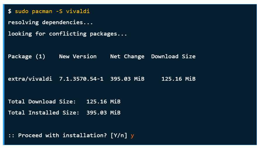 This command tells the system to fetch the Opera package from AUR and begin installation. You may see several prompts asking for confirmation. Simply type Y and press Enter to continue.